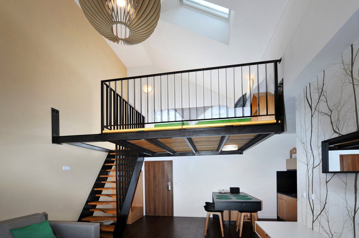 V mezonetovém apartmánu je v dolní části obývací pokoj s rozložitelnou sedačkou, kuchyňka (myčka na nádobí, dvouplotýnkový vařič, varná konvice, lednička) a ložnice s manželskou postelí. V horní části apartmánu je místnost s manželskou postelí.