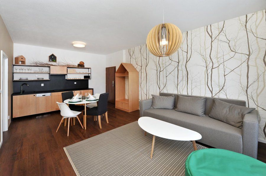 V apartmánu je samostatná ložnice s manželskou postelí, obývacím pokojem s rozložitelnou sedačkou, kuchyňka (myčka na nádobí, dvouplotýnkový vařič, varná konvice, lednička).