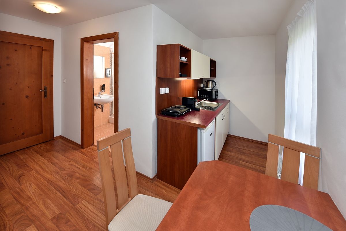 Ubytování v apartmánu je vhodné pro 3-5 osob. Apartmán se skládá z předsíně se šatníkem, ložnice s manželskou postelí a jedním lůžkem, obývací místností s rozkládací pohovkou, konferenčním stolem, TV-Sat, rádiem a ledničkou. Apartmán má samostatnou koupelnu se sprchovacím koutem a WC.