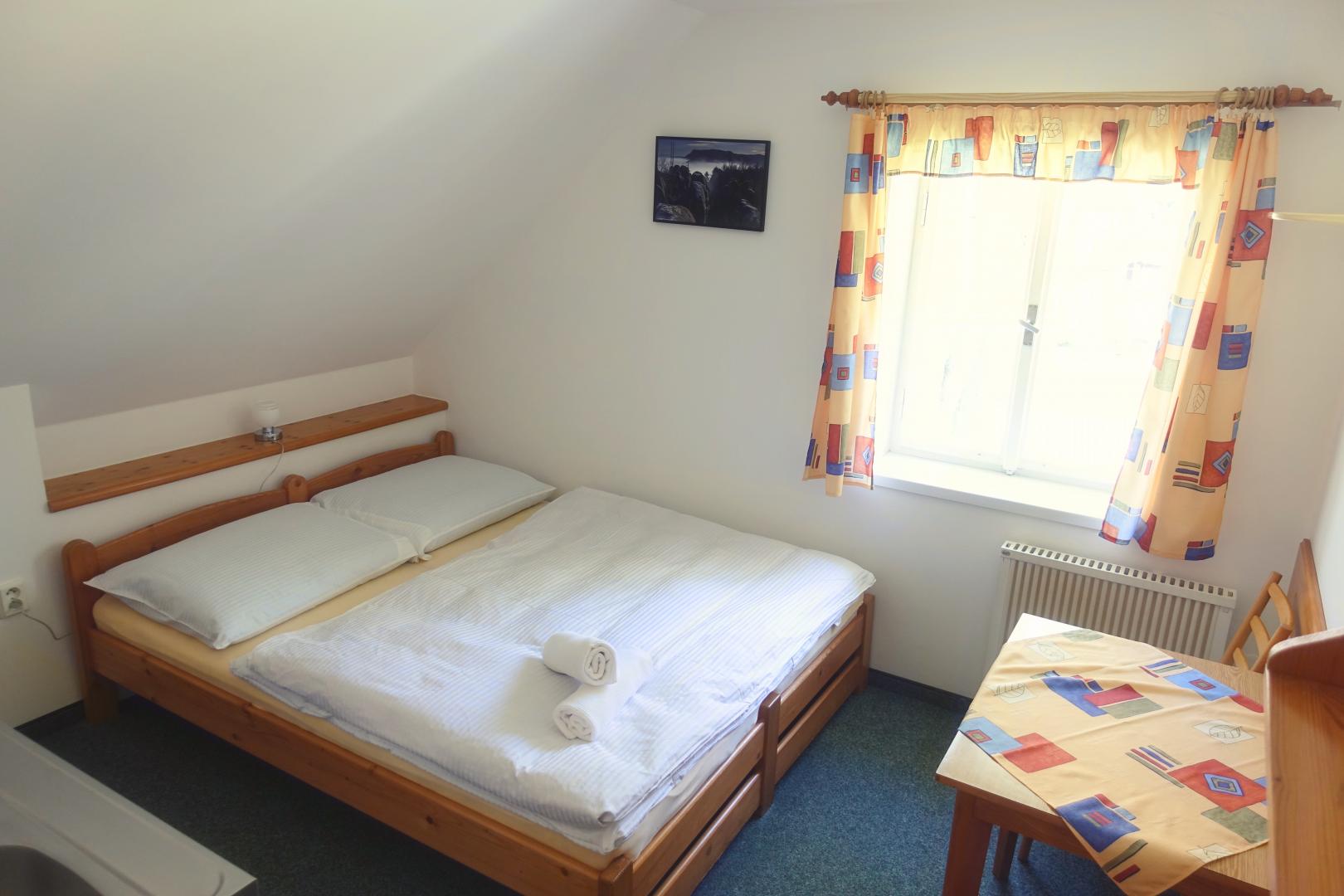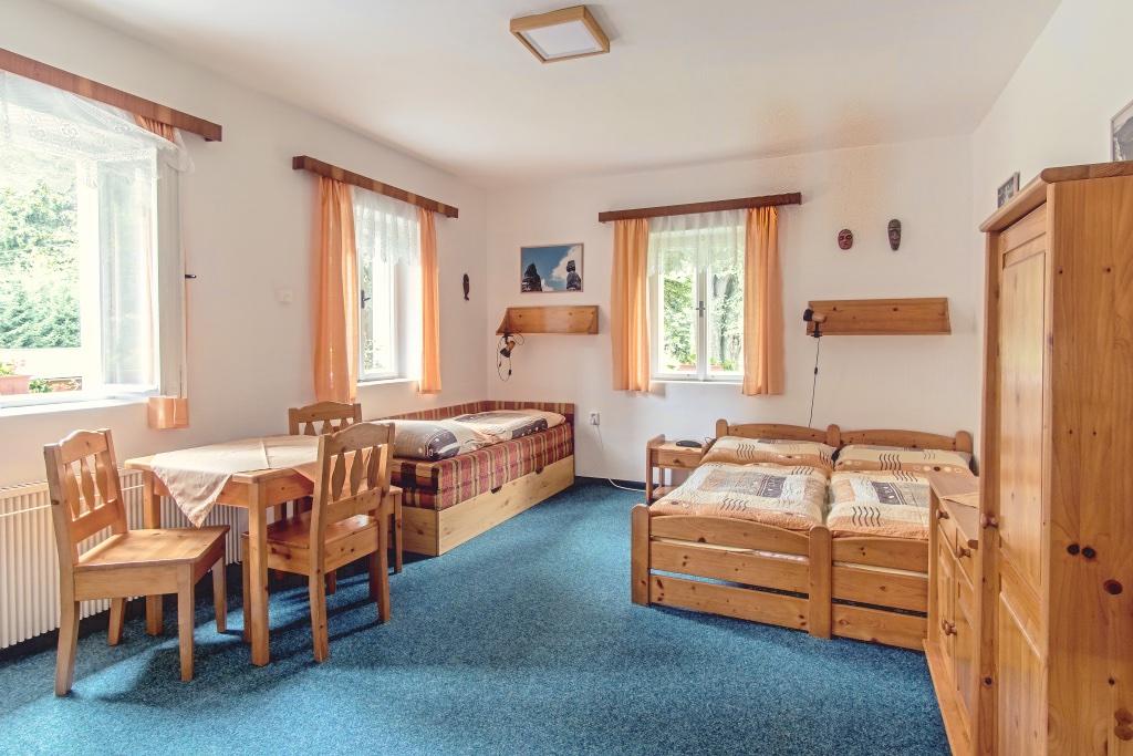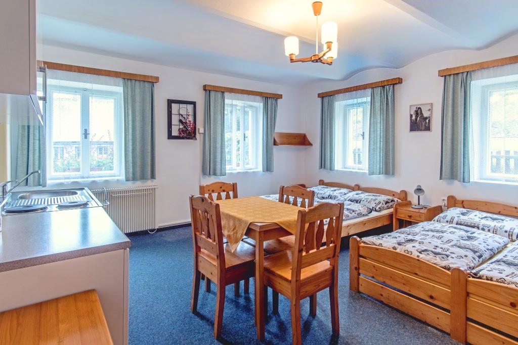 Dvou až čtyřlůžkové pokoje se SWC, kuchyňským koutem s lednicí, vařičem, varnou konvicí a základním nádobím.